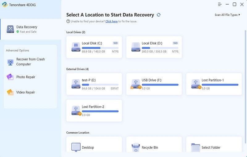 Tenorshare 4DDIG, Windows 11'i destekleyen ve kayıp veya silinmiş dosyaları almak için kullanıcı dostu bir deneyim sunan kapsamlı bir veri kurtarma yazılımıdır. Dahili ve harici sabit diskler, SSD'ler, USB sürücüleri, SD kartlar ve daha fazlası dahil olmak üzere çeşitli depolama cihazlarından verileri kurtarabilir. Yazılım, farklı veri kaybı senaryolarına hitap etmek için birden fazla tarama modu sağlar, bu da onu hem temel hem de gelişmiş kurtarma ihtiyaçları için uygun hale getirir.