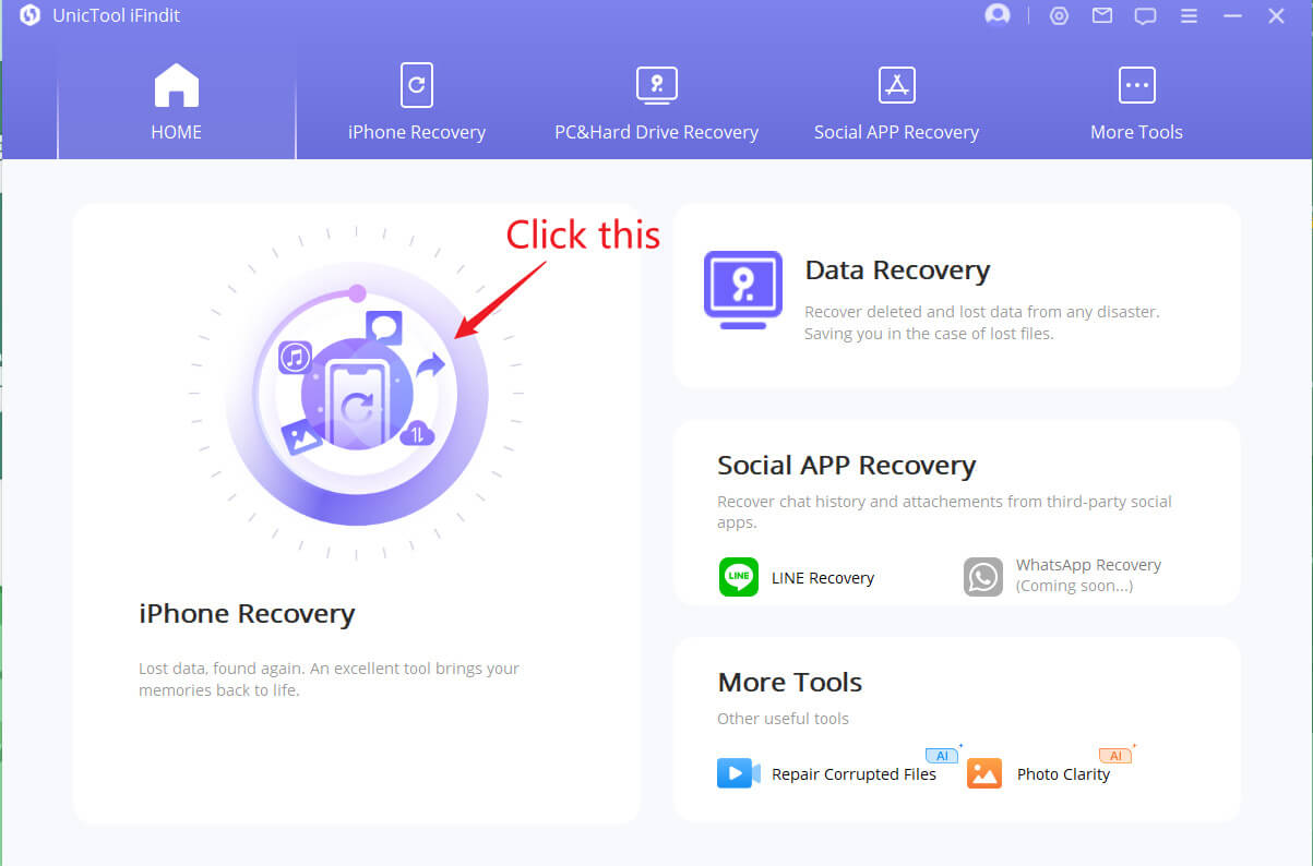 - IFIndit'i indirin ve Windows veya Mac bilgisayarına yükleyin. Kablo ile bağlayın. TıklamakiPhone Kurtarma