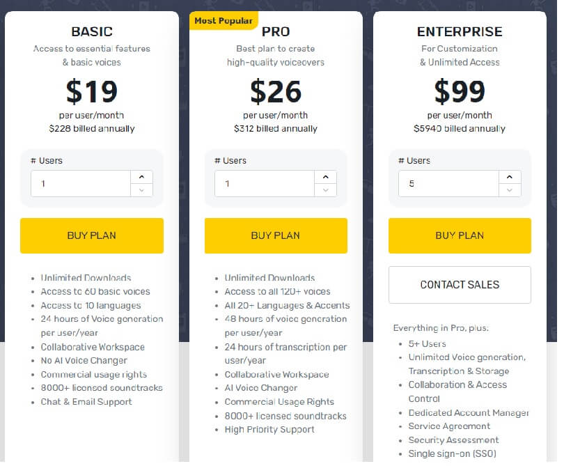 120'den fazla dilde hassas metin-konuşma sesleri, gerçek zamanlı ses ve video işleme, daha fazla gerçekçilik için perde ve vurgu kontrolü, gelişmiş ses modifikasyonu ve ekip odaklı bir kurumsal plan gibi çok çeşitli özelliklerle Murf AI, birinci sınıf bir çözüm olarak öne çıkıyor.