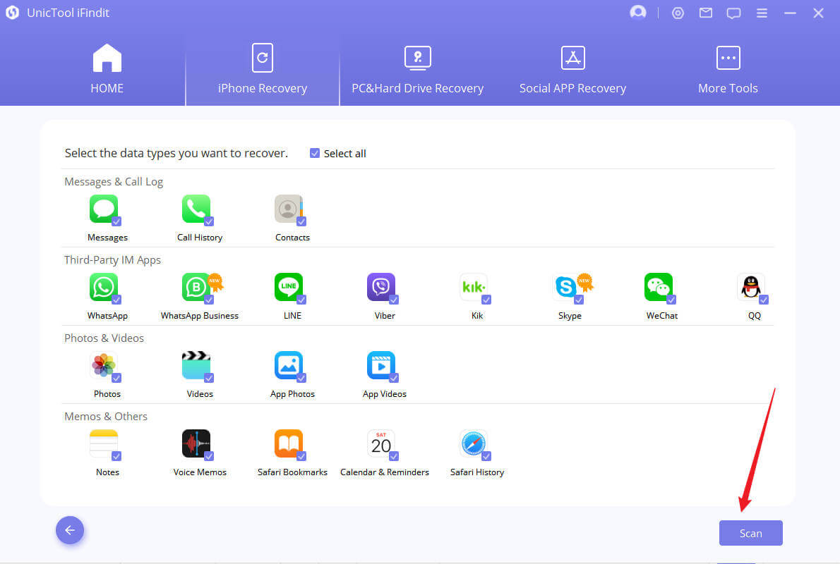 - Kurtarmak istediğiniz verileri seçin ve tıklayınTaramakdüğme