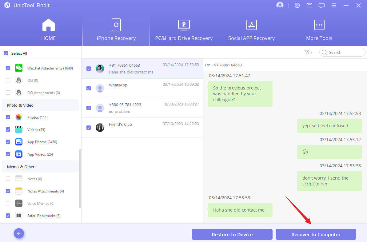 - Kurtarmak istediğiniz verileri seçin ve tıklayınCihaza geri yüklemeveyaBilgisayara Kurtar