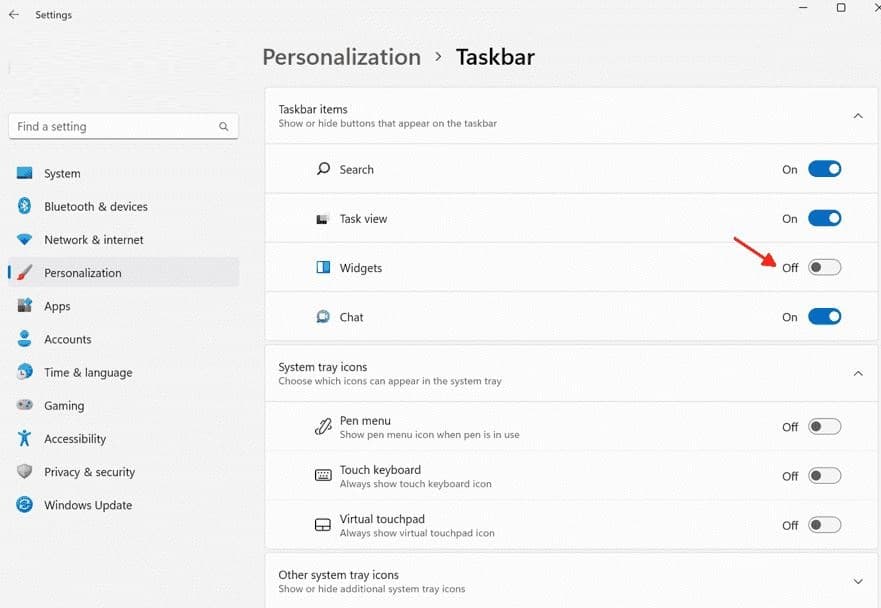 - Ve son olarak, Widget'ların yanındaki geçiş anahtarını kapatın.