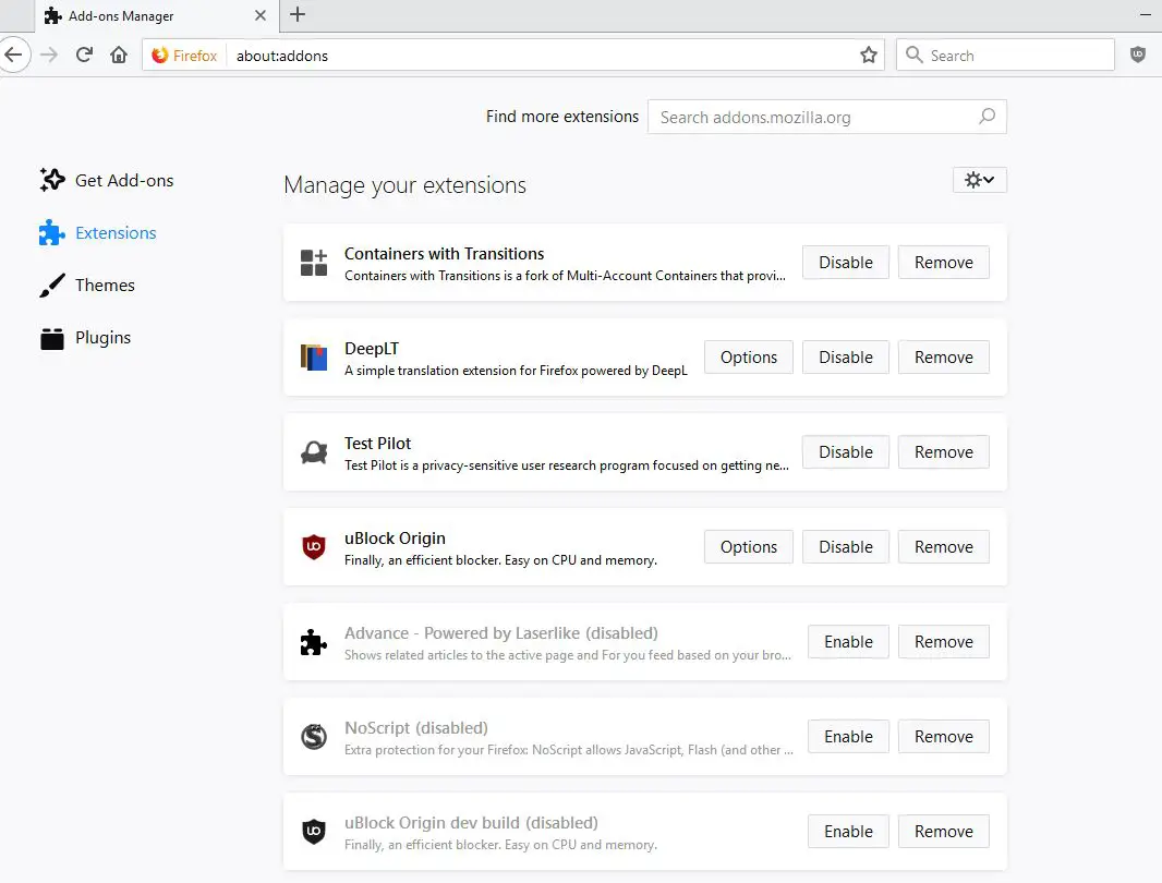 Bu, tarayıcınızda etkinleştirilmiş uzantıların bir listesini görüntüler. Hepsini kapatalım - Ayrıca, geçiş düğmesinin yanındaki Üç Dot Elipsis simgesini tıklayabilir ve Firefox tarayıcısından uzantıyı silmek için Kaldır seçeneğini seçebilirsiniz.