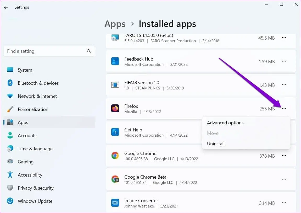 - Listedeki Firefox'u bulun, uygulamanın yanındaki üç noktalı menü simgesini tıklayın ve Gelişmiş Seçenekler'i seçin.