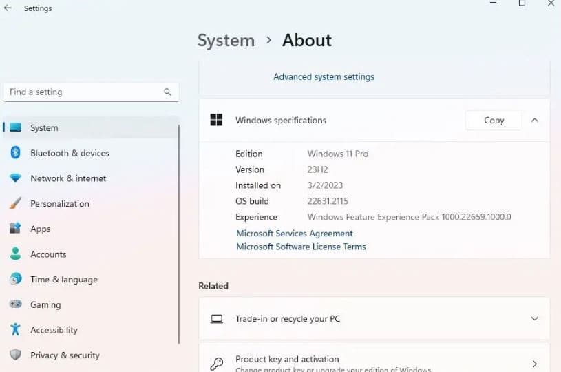 Windows 11 sürüm 23H2 güncellemesi yüklendikten sonra yapı numarası 22631.2115 olarak değişir. Aynısını kullanarak kontrol edebilirsiniz.kazanankomut veya gezinme ayarları -> sistem -> Hakkında, Windows özelliklerinin yanında.