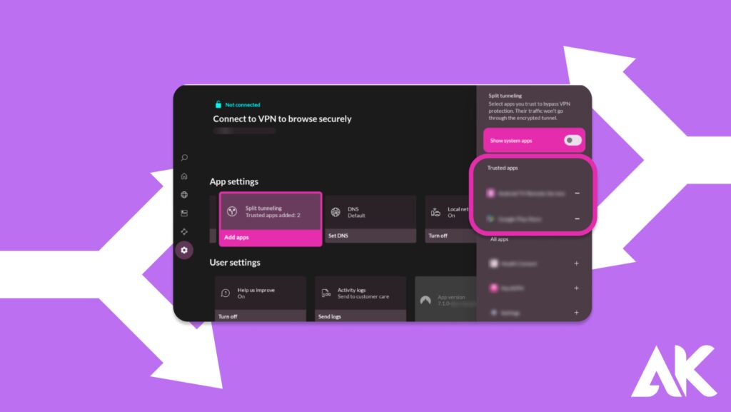 - Uygulama ayarlarını açınve “bölünmüş tünel” veya “baypas VPN” i arayın.