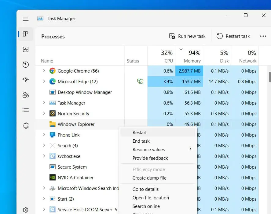 - “Süreçler" sekmesini bulun, " öğesini bulana kadar aşağı kaydırınWindows Gezgini” işlemi – buna sağ tıklayın ve “Tekrar başlat” menüden.
