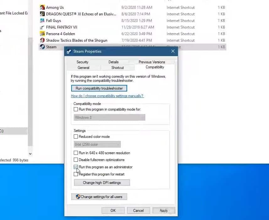 - Şimdi uyumluluk sekmesine geçin ve bu programı yönetici olarak çalıştırmayı etkinleştirin
