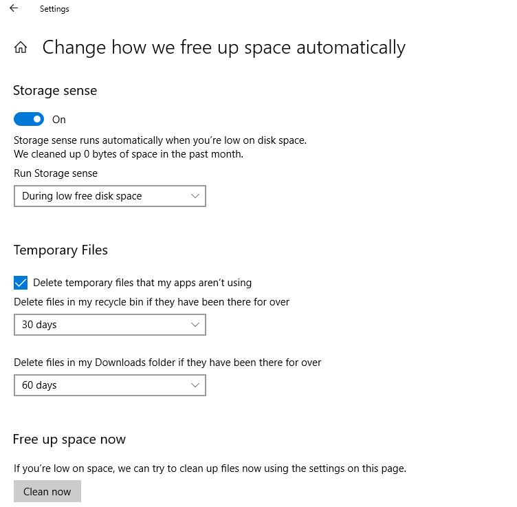 Ve şimdi, Windows PC'nizi sürekli olarak izler ve artık ihtiyacınız olmayan eski önemsiz dosyaları siler; geçici dosyalar; İndirme klasöründeki bir ay içinde değiştirilmemiş dosyalar; ve eski geri dönüşüm kutusu dosyaları.