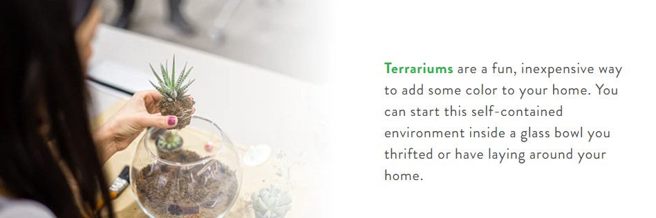 - Bir teraryum başlat. Teraryumlar eğlenceli, ucuz bir yoldurEvinize biraz renk ekleyin. Bu müstakil ortamı, tuttuğunuz veya evinizin etrafında döşediğiniz bir cam kasede başlayabilirsiniz. Aşırı suyu boşaltmak için bir yere kir vermek için altını çakıl, kabuk veya deniz kabukları ile astarlayarak başlayın, sonra hafif, havadar toprak. Şimdi yaratıcı olma zamanı! Süslemek için bitki ve ezilmiş figürin kombinasyonlarını kullanın.