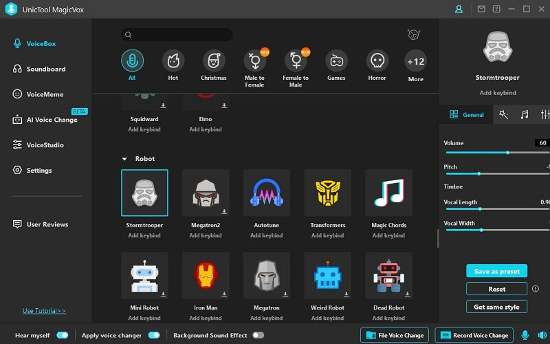 Stormtrooper ses değiştirici, bir ses modülatörü kullanarak gerçek birstormtrooper sesini taklit etmenizi sağlar. UnicTool MagicVox ses değiştiriciyle 500'den fazla ses değiştirme efekti arasından seçim yapabilirsiniz. Stormtrooper sesinizi mükemmel filtreyle özelleştirin ve oyun oynarken veya canlı yayın yaparken paylaşın.