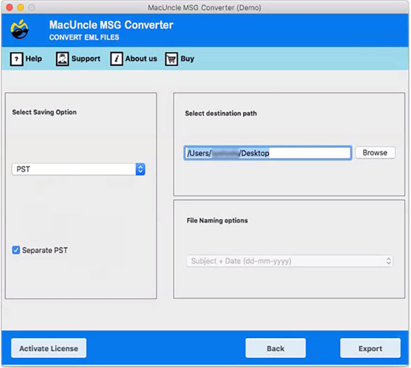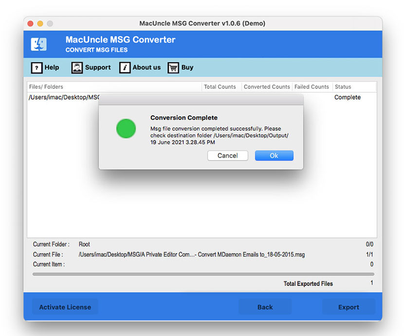 - Son olarak,Dışa Aktar düğmesiMSG dosyasını içe aktarmak için Outlook Mac işlemine.