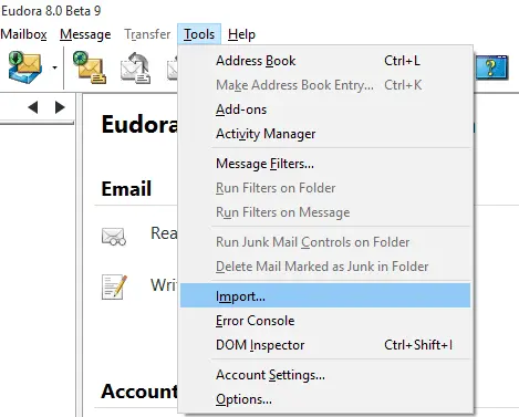 - Eudora Mail -Eudora Mail e -posta istemcisini çalıştırın ve tıklayınAletlerVe bundan sonraİçe aktarmakEkran görüntüsünde gösterildiği gibi ortaya çıkan Mbox dosyalarını yükleme seçeneği.