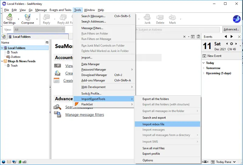 - Seamonkey -Seamonkey, Mozilla Thunderbird'e benzer, bu nedenle Free Free eklentisini (ImportExport Tools) indirin, sonra verilen ekran görüntüsünde görebileceğiniz gibi SeamOnkey'de posta kutularını içe aktarabilirsiniz.