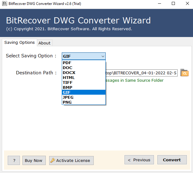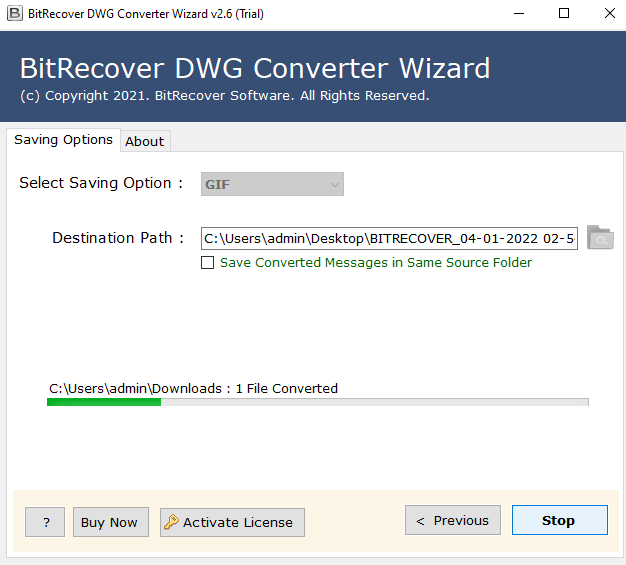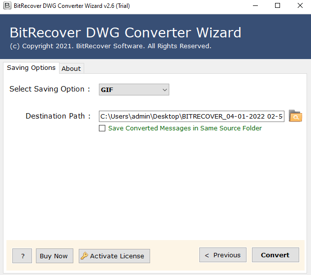 AutoCAD'i GIF animasyonlu görüntülere dönüştürmek için manuel veya standart bir teknik yoktur. Bu nedenle, otomatik bir çözüm kullanabilirsiniz.Bitrecover DWG DönüştürücüBu sorunu çözmek için. Bu tek noktadan çözüm, bir kullanıcının AutoCAD dosyasını toplu olarak GIF olarak kaydetmesini sağlar. DWG'yi GIF dosyalarına dönüştürmek için sisteminizde AutoCAD'a gerek yoktur.
