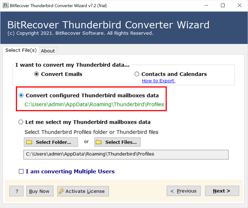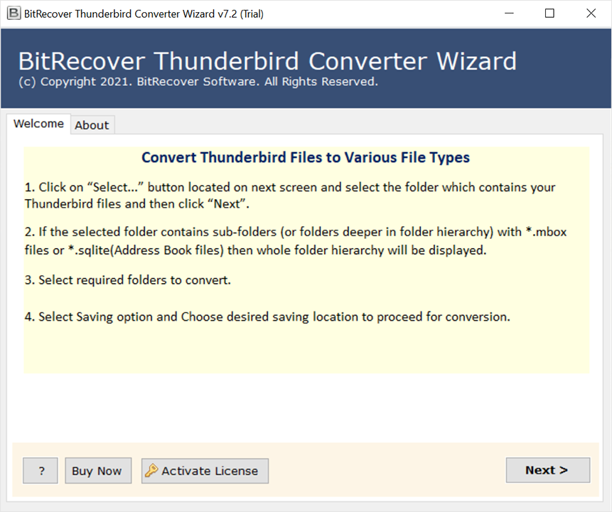 Burada size en iyi ve en doğrudan çözümlerden birini göstereceğizBitrecover Thunderbird DönüştürücüMbox dosyasını Thunderbird'den dışa aktarmak için. Araç, toplu ve seçilen e -posta dönüştürme gibi birçok gelişmiş özellik ve özellik vardır. Ayrıca, bu Thunderbird Export Mbox aracıyla ilgili en iyi şey, herhangi bir üçüncü taraf aracı indirmeye gerek olmamasıdır. Ayrıca, kullanıcılar aracı en son sürümler de dahil olmak üzere herhangi bir Windows işletim sistemine yükleyebilir ve Thunderbird Mbox dışa aktarmasını başarıyla yapabilir. Bunun üzerinde ve üstünde, Thunderbird'den Mbox aracının gelişmiş özellikleri ve çalışma adımları aşağıda belirtilmiştir.