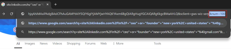 - Şimdi ekleyeceğiz"& Num = 100"Bir sayfada 100 sonuç görüntülemek için URL'nin sonunda.