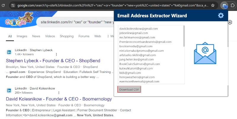KullanmaKrom uzantısıLinkedIn'den e -posta adreslerini ücretsiz olarak kolayca çıkarabilirsiniz. Bu Google Chrome uzantısı sınırsız kullanım için serbestçe kullanılabilir. Ayrıca, bu uzantı, tüm LinkedIn çıkarılan e -posta adreslerini varsayılan olarak bir CSV dosyasında birleştirme işlevselliğine sahiptir. Bununla birlikte, görevimizi uzatma yoluyla tamamlamanın önkoşulu, Google arama operatörleri hakkında bazı temel bilgilere sahip olmaktır.