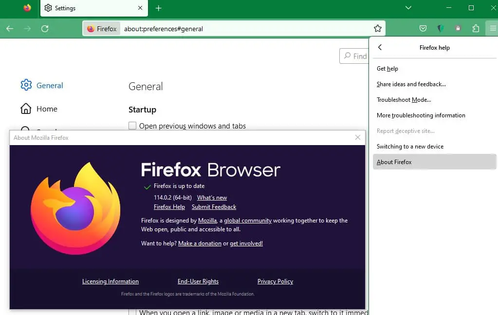 Eski veya eski bir tarayıcı kullanmak, uyumluluk sorunları, kaçırılmış performans geliştirmeleri ve potansiyel güvenlik açıkları nedeniyle yavaş web sayfası yüklemesine yol açabilir. VeFirefox'u en son sürüme güncellemePotansiyel olarak yavaş yükleme sorunlarının çözülmesine yardımcı olabilir.