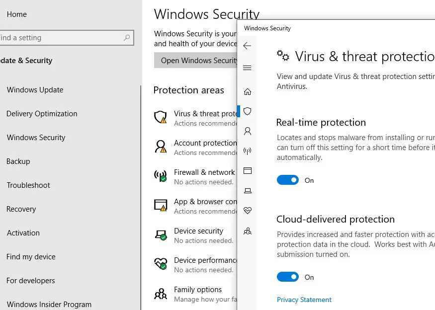 - 'Windows Defender'a tıklayın ve ardından Gerçek zamanlı koruma alanını kapatın.