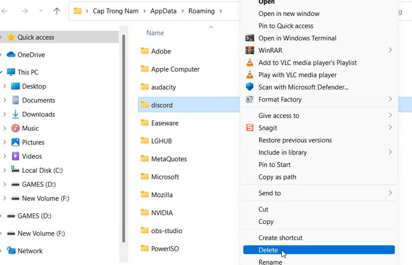- Açık Çalışma (Windows + R)> % Type AppData %> Discord klasörünü sil.