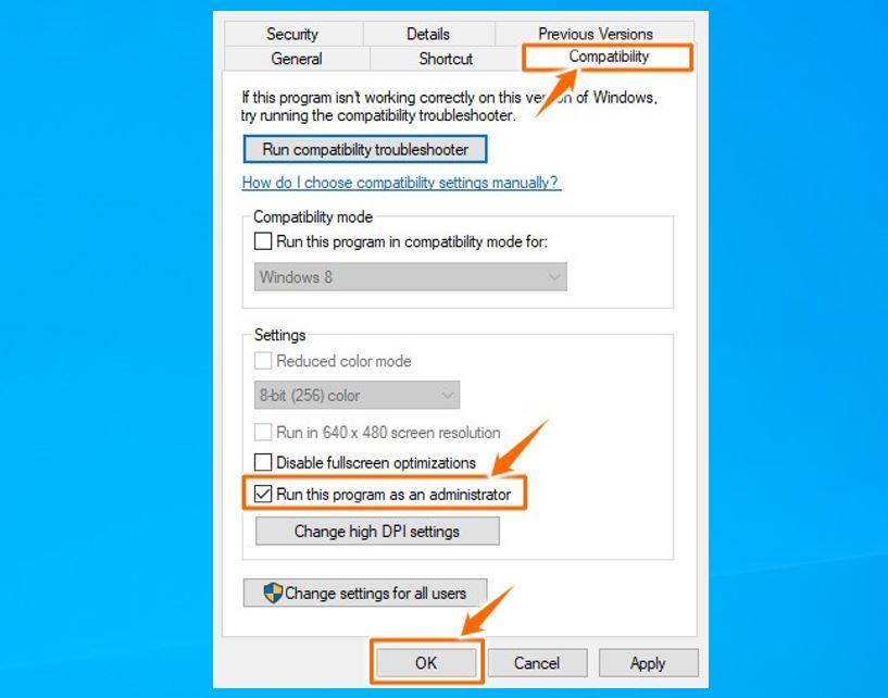 - Bu programı uyumluluk modunda çalıştıran kutuyu kontrol edin: Windows 8'i (veya gerekirse Windows 7) seçin.