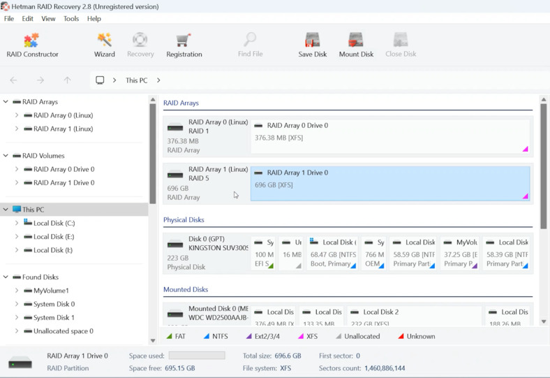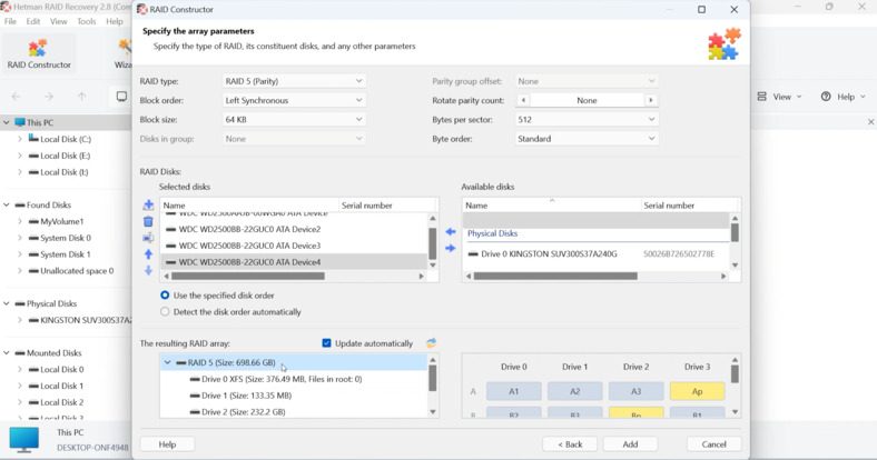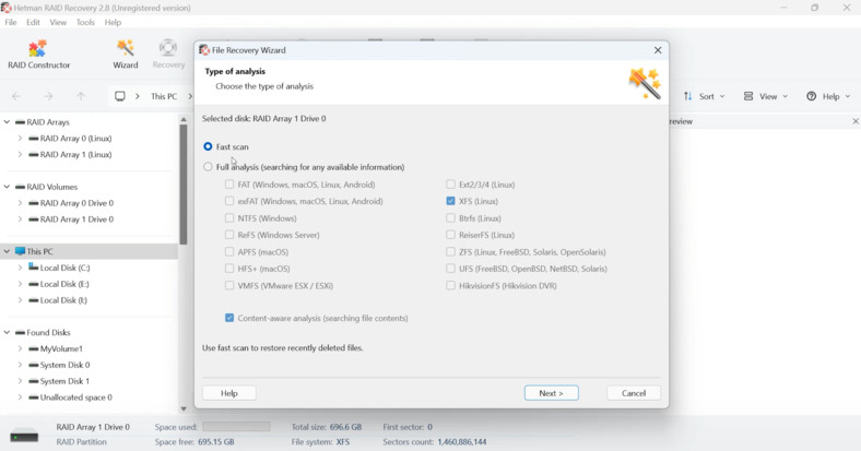 Hetman Raid Recovery'nin bir avantajı, programın belirtilen parametreleri gerçek zamanlı olarak analiz etmeye çalışmasıdır. Doğru girilirse, diziniz ve Dosya Sistemi (XFS) hakkında bilgiler yapıcı penceresinde aşağıda görünebilir. Disk yapısını görebiliyorsanız, doğru yoldasınız!