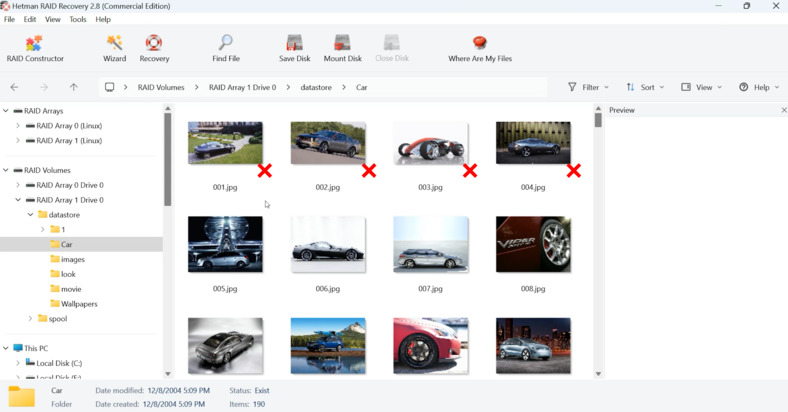 Gösterildiği gibi, program dizi sürücülerinde kalan tüm dosyaları kolayca buldu. Ayrıca, kırmızı haç ile işaretlenmiş silinmiş verileri de buldu.