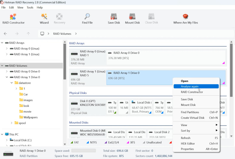 Bu gibi durumlarda ana kural, sürücülerle “denemek” ve NAS'ın kendisinde dizi yeniden oluşturulmasını başlatmamaktır, çünkü bu verilere kalıcı olarak zarar verebilir. En uygun yaklaşım, sabit sürücüleri kaldırmak, bunları bir bilgisayara bağlamak ve gibi özel çözümler kullanmaktır.Hetman Raid Kurtarma. Bu yazılım, neredeyse yeniden yaratmanızı sağlar.Raid 5yapı, okuXFS'deDosya sistemi ve dosyalara erişimi geri yükleyin.