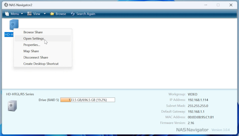 Depolama Yönetimi Paneline erişmek için lansmanNas Navigator, cihazı listede bulun ve ayarlarını açın (sağ tıklayın-Ayarlar Aç).