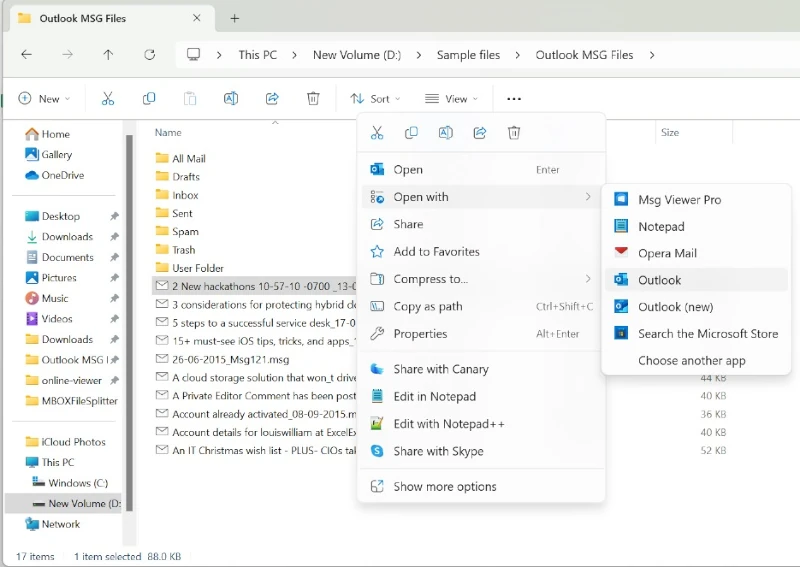 GitMsg dosyası>Sağ tıklayın ve> ile açmayı seçin "Outlook" u seçinyerine"Outlook (yeni)" >tıklamakAçık. Bitrecover tarafından sağlanan doğrudan aracı da kullanabilirsiniz.