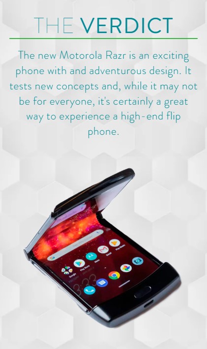Yeni Motorola Razr, maceracı bir tasarıma sahip heyecan verici bir telefon. Yeni kavramları test ediyor ve herkes için olmasa da, kesinlikle üst düzey bir flip telefonu deneyimlemek için harika bir yol. Akıllı flip telefonlar tamamen yeni ve klasik flip telefonu güncellemek kesinlikle ilginç bir fikir. İster hepsinin nostaljisi üzerinde durmak veya serin katlanabilir telefonunuzu göstermek istiyorsanız, yeni Motorola Razr birçokları için mükemmel bir cihaz olduğunu kanıtlıyor.