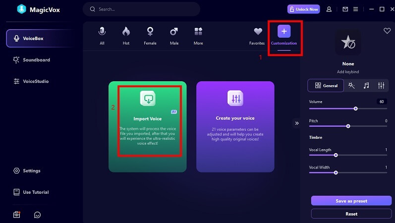 - 6VoiceBox'a göz atın ve içe aktarılan ses yoluyla Trump AI sesini özelleştirmeyi seçin, Trump AI ses modelini klonladığınızda, ardından onu seçin, şimdi konuşabilir ve eğlenebilirsiniz