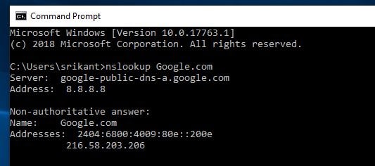 Devam etmeden önce komut istemini açın, yazınnslookup google.comve Enter tuşuna basın. IP adresini geri alamazsanız, bu sadece internet bağlantınızdır. Kablolu bir bağlantı kullanıyorsanız, kabloların düzgün bağlanıp bağlanmadığını kontrol edin. Kablosuzsa, yeniden bağlamayı deneyin. Veya bu İnternet bağlantısı sorun giderme adımlarını deneyin.