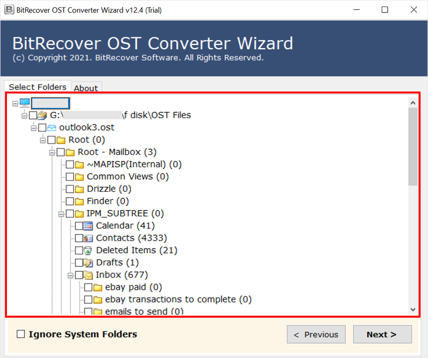 - OST Klasörlerini SeçinYazılım arayüzünden IE gelen kutusu, taslak, silinmiş ürünler, gönderilen öğeler, önemsiz e-posta, kişiler, takvimler vb.