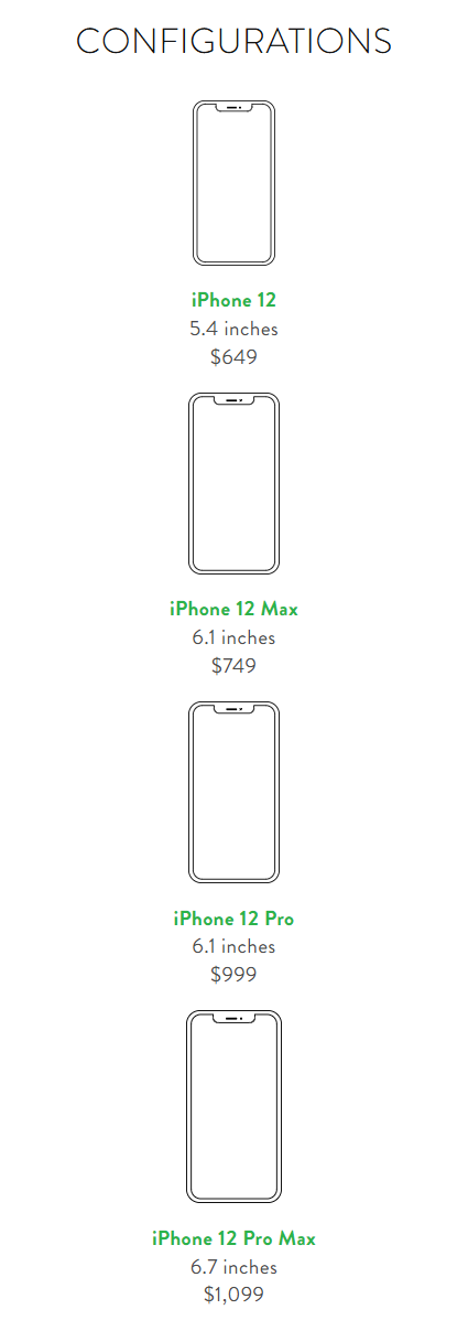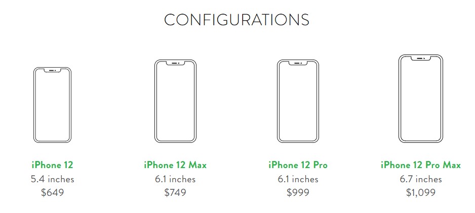 Ayrıntılara girmeden önce, hangi seçeneklerden bahsettiğimize bir göz atalım. Tüm koleksiyon muhtemelen birİPhone 12, 12 Max, 12 Pro ve 12 Pro Max. Tüm modellerin 5G olması, ancak mutlaka mmwave teknolojisi olmamalıdır. Bu 12 Pro ve Pro Max için ayrılabilir.
