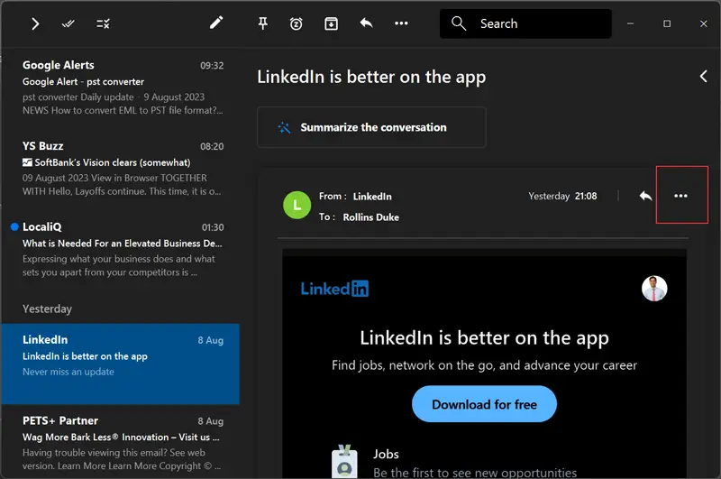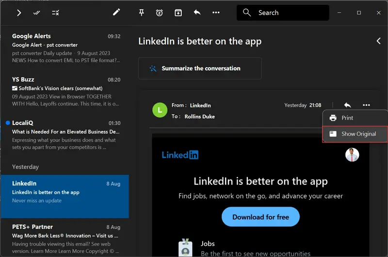 Yöntem 2: Kanarya Postasını EML dosyasına dışa aktarın