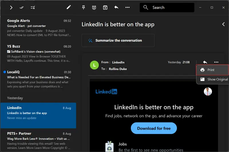 - Tıklayın3 noktaSimge ve açılır listeden yazdırmayı seçin.