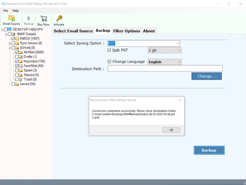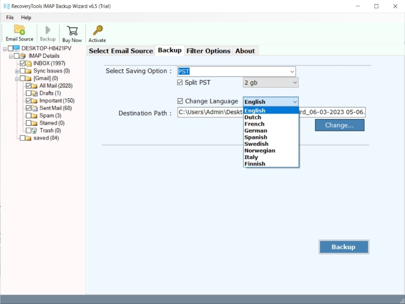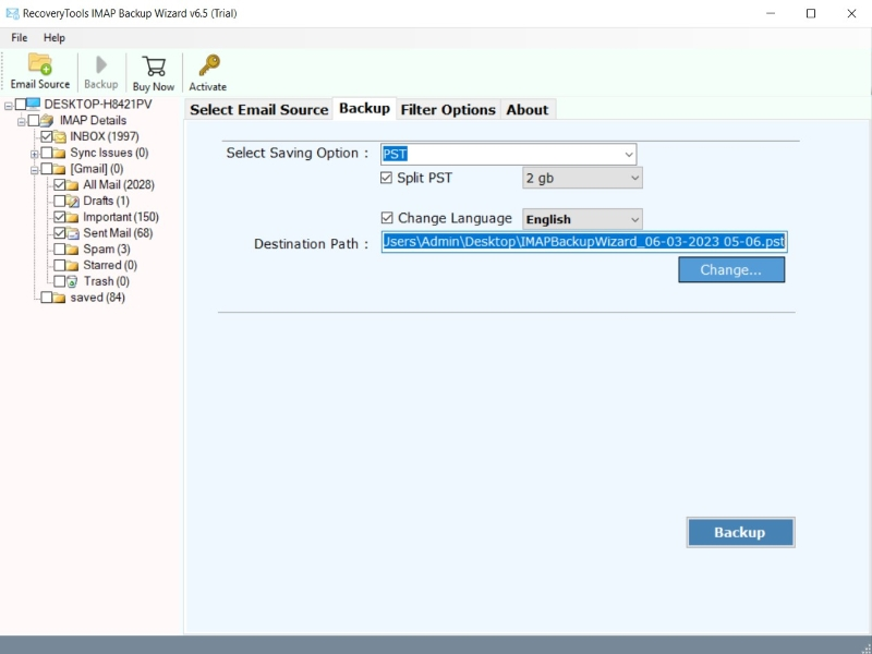 - Adım 5:Son olarak tıklayınYedeklemeKanarya posta e -postalarını dışa aktarmak için.