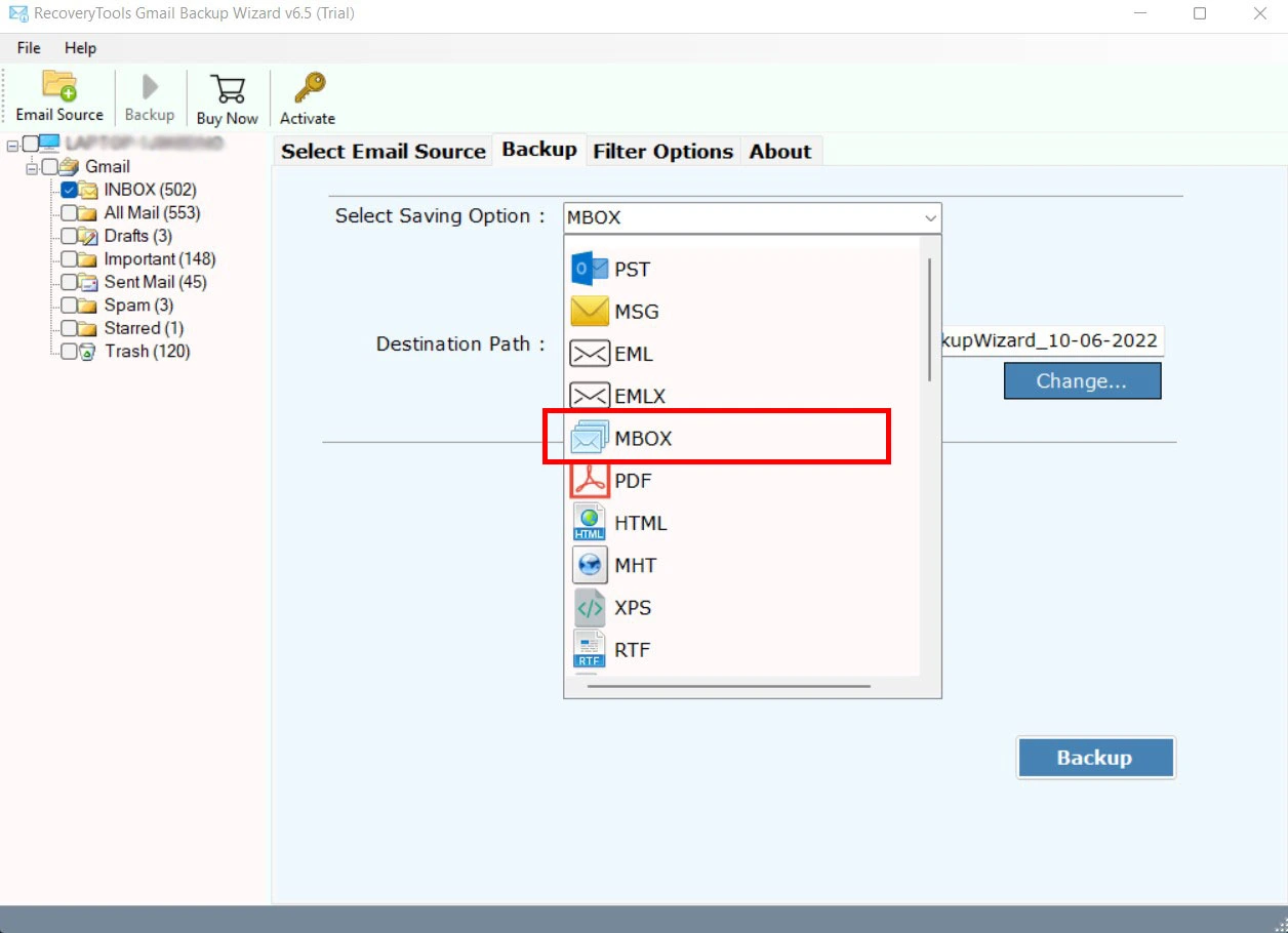 - Şimdi yedekleme bölümüne gidin veMoksKaydetme formatınız olarak. Bu araç, Mbox dosyanızı tarih açısından, konu bazından, TO'dan, vb.
