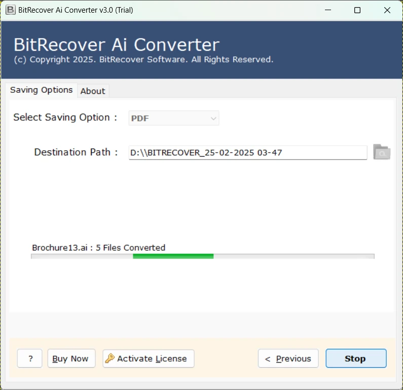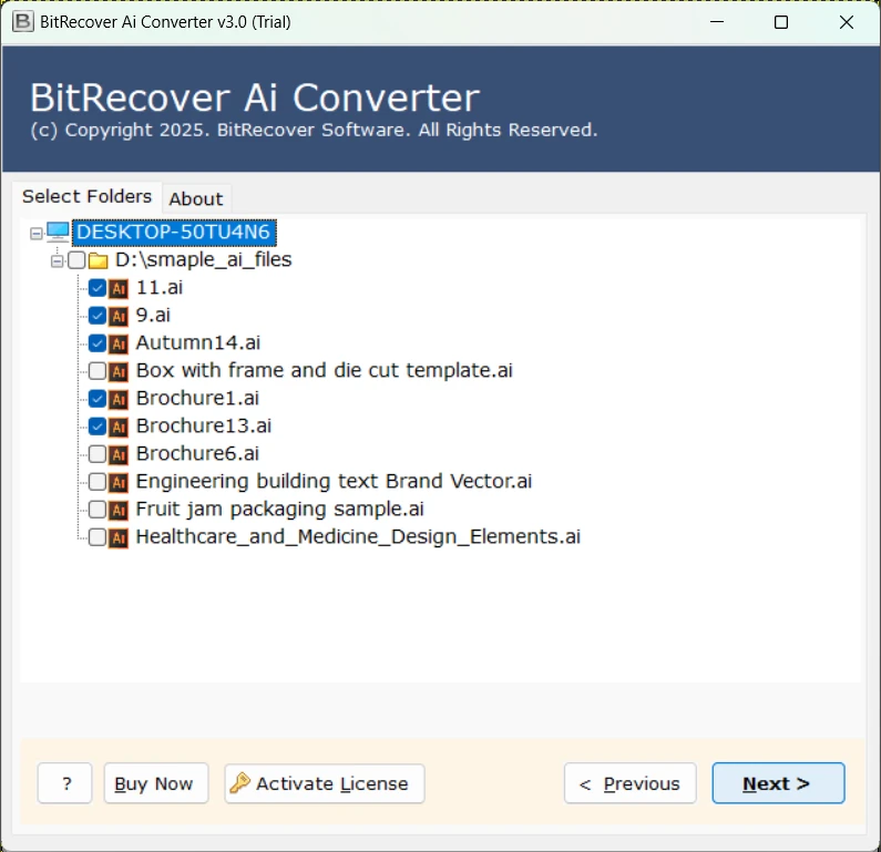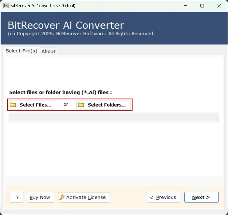 Manuel yöntemlerin çoklu sınırlamalarını vurguladığımız için, mühendis ekibimiz manuel süreçlerin tüm sınırlamalarının üstesinden gelmek için profesyonel bir yazılım geliştirmiştir. .Bitrecover AI Dönüştürücü Sihirbazıtek bir işlemde birden fazla AI dosyasını TIFF'e ve JPG, PNG, PDF, DOC vb. Gibi diğer birçok dosya formatına dönüştürebilir. AI -TIFF Converter aracı, kullanıcıların AI dosyasını gereksinimlerine göre TIFF'ye dışa aktarmak için ayrı dosya veya klasörleri seçmeleri için çift seçenekler sunar. Illustrator'ı Tiff'e dışa aktarmak için yazılımı kullanmak için basit bir kılavuzdan geçelim.