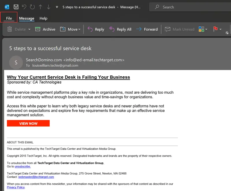- MS Outlook'un arayüzü kullanılarak bir MSG dosyası açılacak, seçinDosyaseçenek.