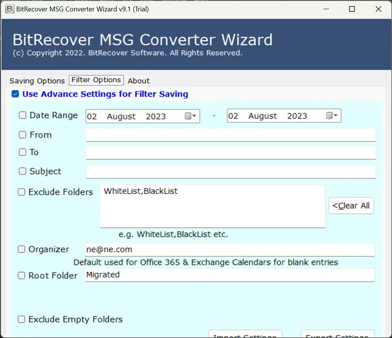 - Kullanmakavans filtresiSeçici e -posta dönüştürme seçenekleri.