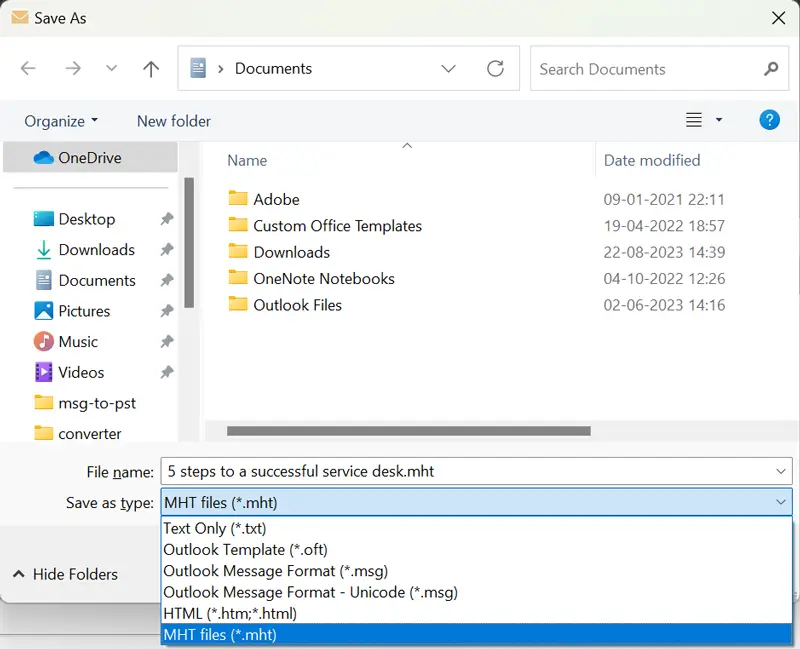 - SeçmekTür Olarak KaydetAçılır listeden msg dosyaları (*.mht).