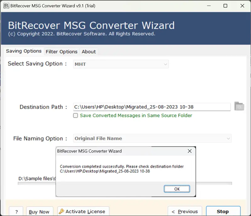 - MSG'den MHT'ye dönüşüm işlemi başarıyla tamamlandı, vurulduTAMAM.