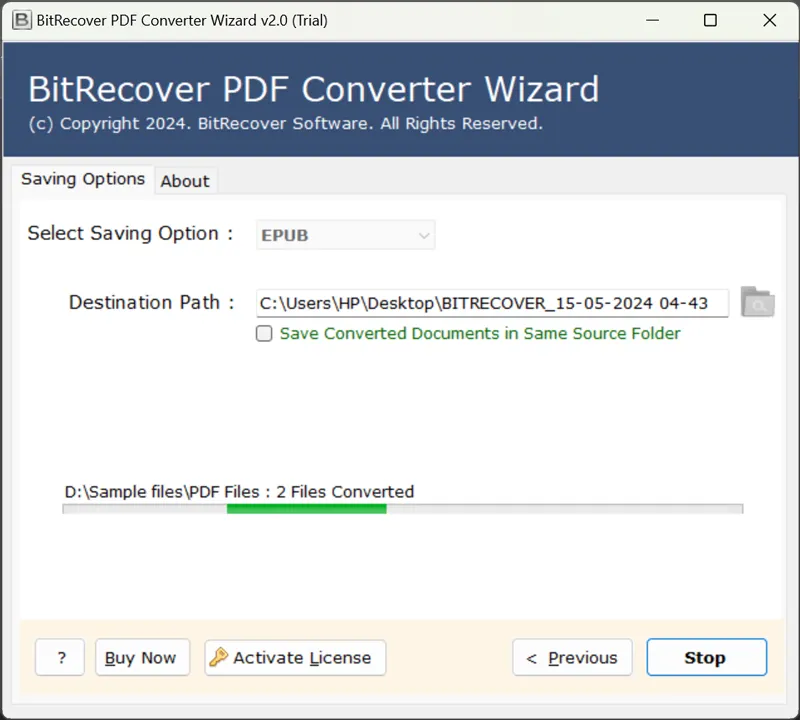 İndir ve KurulBitrecover PDF Dönüştürücü Aracıçünkü biçimlendirmeyi kaybetmeden PDF'yi epub'a dönüştürmenin en iyi yolunu sunar. Bu, herhangi bir ek uygulamadan yardım almadan birden fazla PDF belgesinin formatlarını EPUB olarak değiştiren güvenli ve güvenli çevrimdışı PDF'den Epub Converter yazılımıdır.