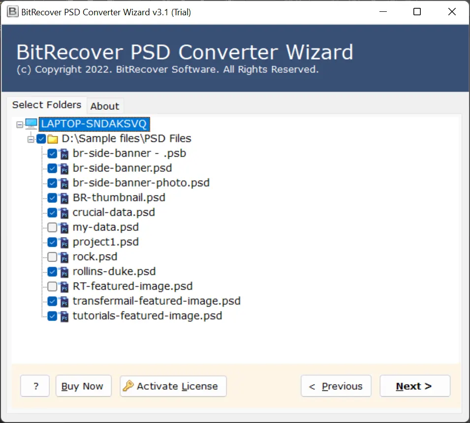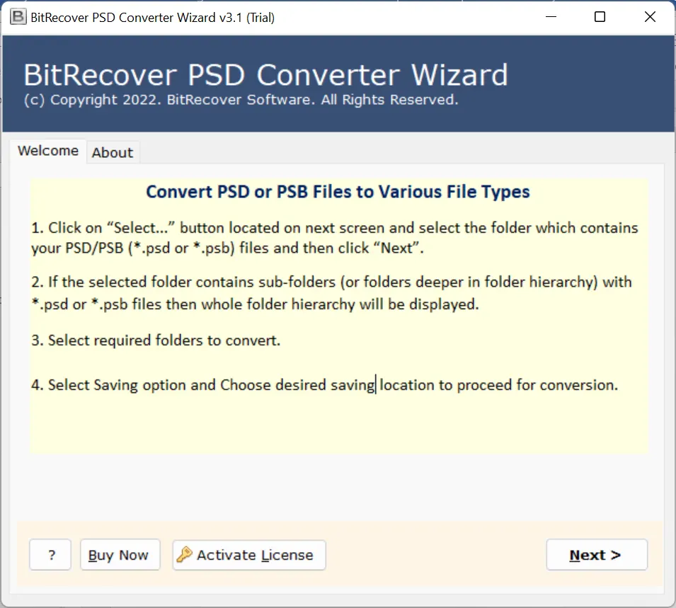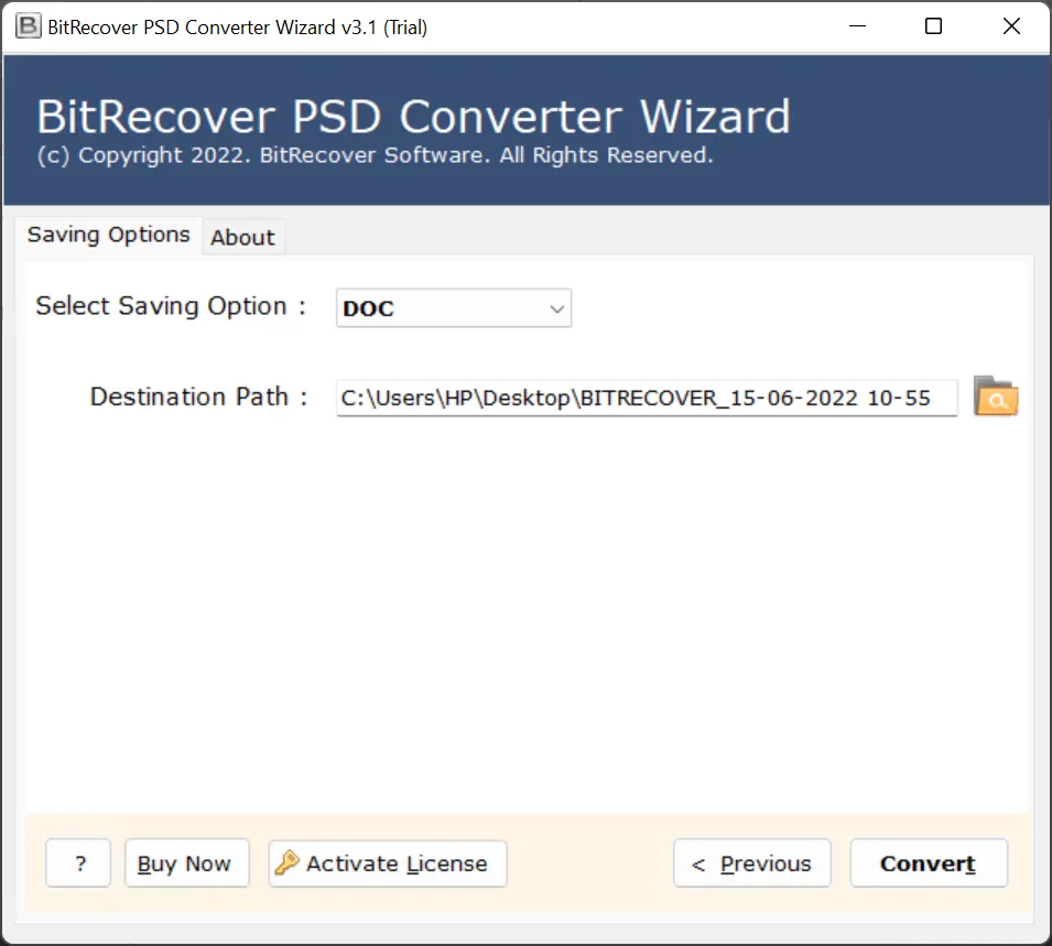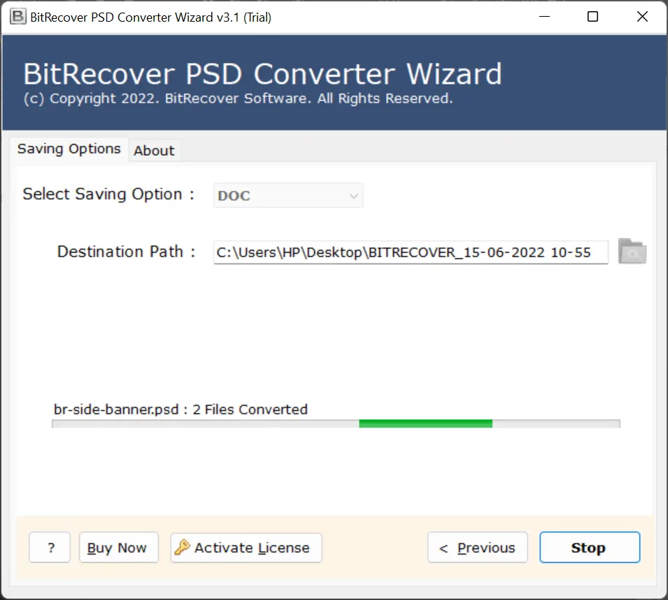 DOC dosyalarının avantajlarını öğrendikten sonra ihtiyaçlarınıza en uygun yazılımın hangisi olduğunu merak edeceksiniz. Bu yüzden,BitRecover PSD Converter en iyi ve en basit çözümdürPhotoshop katman görüntülerini DOC belgelerine dönüştürmek için. Bu, Photoshop PSD'nizi görüntü kalitesinden ödün vermeden DOCX formatına kaydetmenizi sağlayan bağımsız bir çözümdür. Ayrıca canlı PSD dönüştürme işleminin durumunu yazılım panelinde önizleyebilirsiniz.