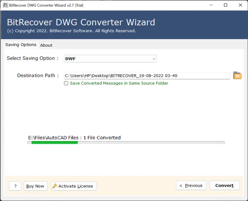 En güvenilir ve iyi önerilen araçlardan biri,Bitrecover DWG Dosya Dönüştürücüher ciddi tasarımcının araç seti için olmazsa olmaz. Verileri toplu veya kısmen dönüştürmeye ek olarak, araç çok daha fazlasını yapabilir. Buna ek olarak, sezgisel ve benzersiz kullanıcı arayüzü sayesinde çok çeşitli tüketicilere hitap eder.