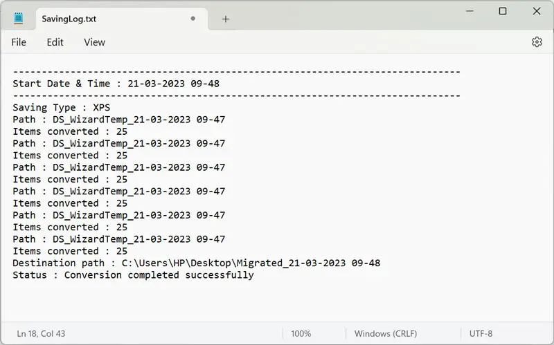 - Araç otomatik olarak üretir ve açarLog Rapor Dosyasıdönüştürülmüş veriler hakkında.