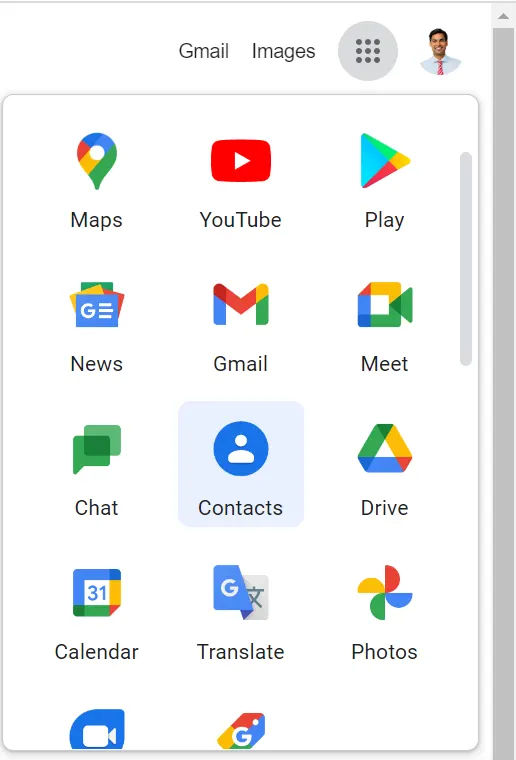 - Izgara simgesine tıkladıktan sonra Google Applications'tan Kişiler seçin.